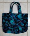 Tote bag handmade and donated by Margaret Townsend. Underwater design of green, turquoise, purple and navy on black with tiny dashes of pink. Measures 14" wide by 10" deep, plus handles.