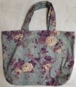 Large tote bag will help you be green while shopping or just carrying your things. 19" X 14" plus handles. Floral pattern on grey background; cream and soft violet flowers with purple. Made and donated by Margaret Townsend